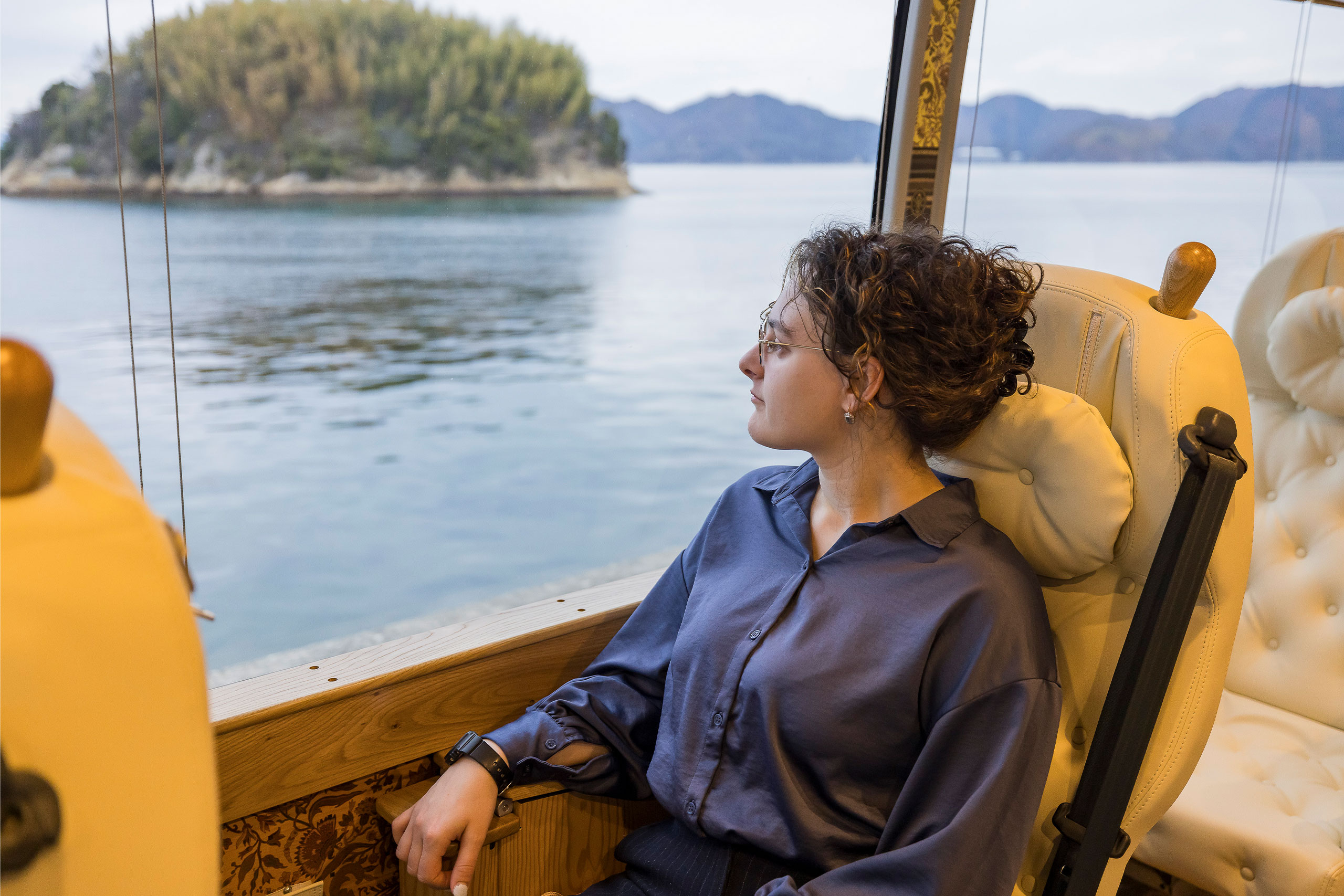 Designed by renowned industrial designer Eiji Mitooka, the YUI PRIMA OLIVIA vehicle is crafted to deliver the utmost in comfort. In contrast to conventional 45-seat sightseeing coaches, it offers an exclusive 21-seat layout, creating a spacious and refined atmosphere. Its vivid blue exterior evokes the majestic beauty of the Seto Inland Sea, heightening anticipation for the journey ahead.
