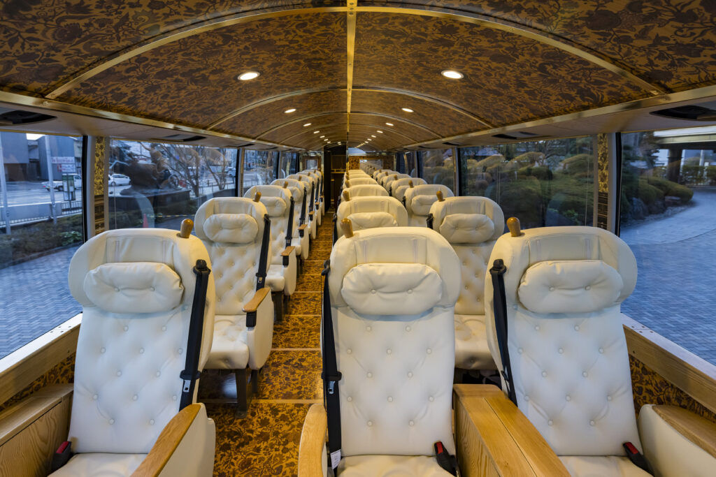 Designed by renowned industrial designer Eiji Mitooka, the YUI PRIMA OLIVIA vehicle is crafted to deliver the utmost in comfort. In contrast to conventional 45-seat sightseeing coaches, it offers an exclusive 21-seat layout, creating a spacious and refined atmosphere. Its vivid blue exterior evokes the majestic beauty of the Seto Inland Sea, heightening anticipation for the journey ahead.